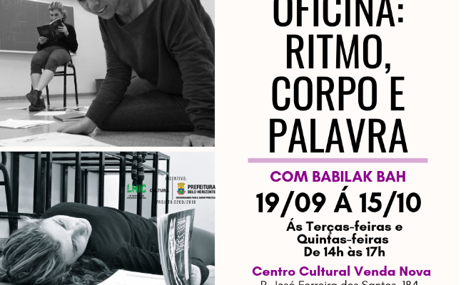 A ‘Oficina: ‘Ritmo Corpo e Palavra’ será ministrada gratuitamente de 19 de setembro à 15 de outubro, às terças-feiras e quintas-feiras, de 14h às 17h, no Centro Cultural Venda Nova (Rua José Ferreira dos Santos, 184, Jardim dos Comerciários, Belo Horizonte/MG) por Babilak Bah, artista do ruído, poeta e arte-educador.